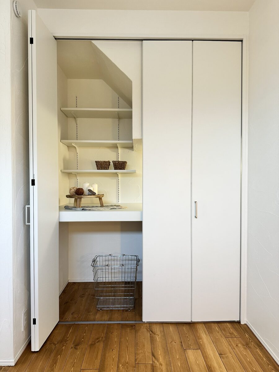 日用品やストック品もすっきり収まり、扉を開けるたびに気持ちが整う収納スペースです。