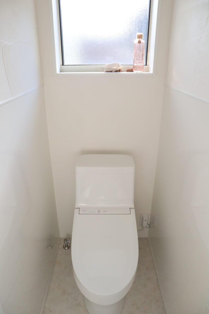 トイレの壁は、腰高までパネル仕上げに。毎日使う場所だからこそ、お掃除のしやすさを大切にしました。上部は漆喰仕上げで、空気を整えてくれるのも嬉しいポイントです。